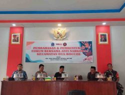 BONE, NALARMEDIA — Kepala Desa (Kades) Uloe, Abdul Rahman Hafid didapuk menjabat sebagai Ketua Forum Bersama (Forbes) Anti Narkoba Bone di Kecamatan Dua Boccoe.