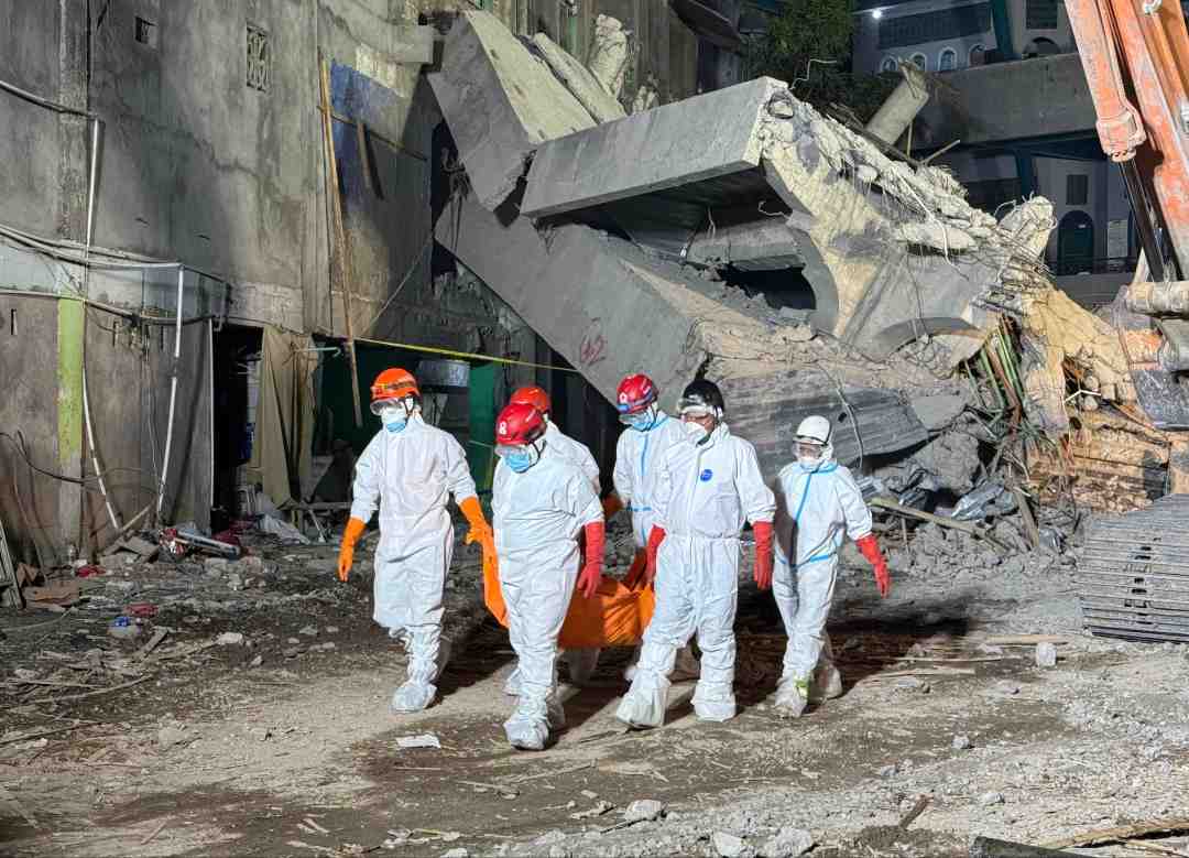 Proses pembersihan puing-puing bangunan empat lantai tersebut terus dilakukan dengan bantuan alat berat.
