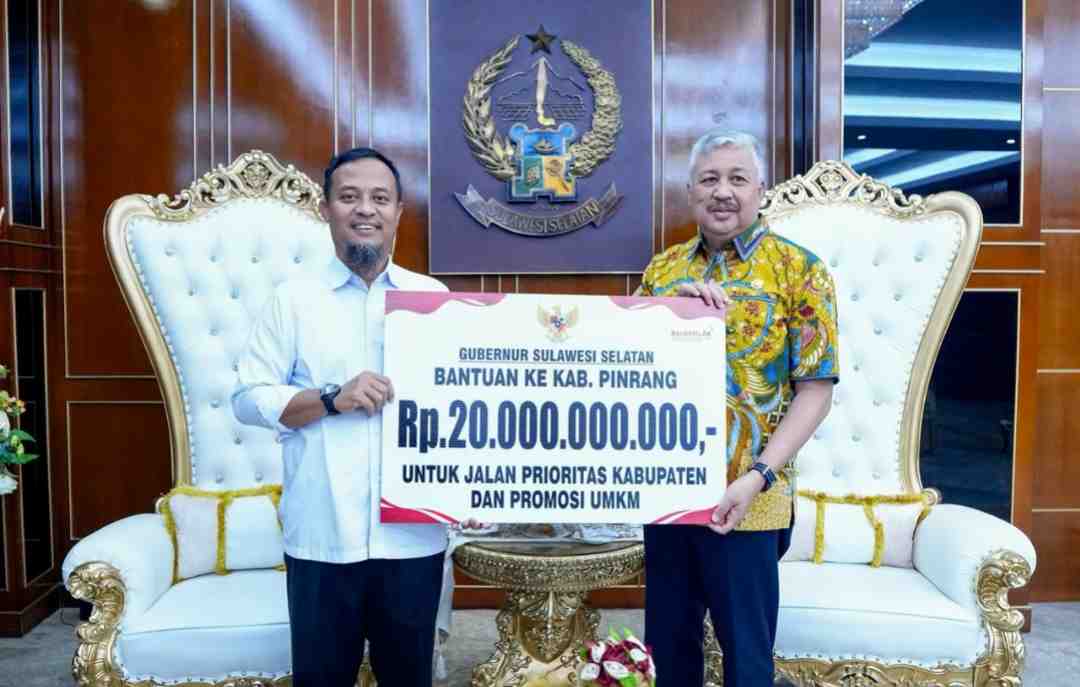PINRANG, NALARMEDIA – Gubernur Sulsel Andi Sudirman Sulaiman menyerahkan bantuan keuangan senilai Rp20 miliar kepada Pemerintah Kabupaten (Pemkab) Pinrang.