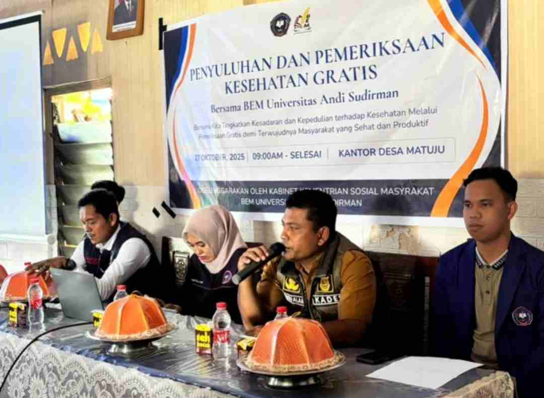 BONE, NALARMEDIA — BEM Universitas Andi Sudirman (Uniasman) gelar Program Kerja berupa penyuluhan dan pemerikasaan kesehatan gratis di Desa Matuju, Kecamatan Awangpone, Kabupaten Bone, Senin (27 Oktober 2025).