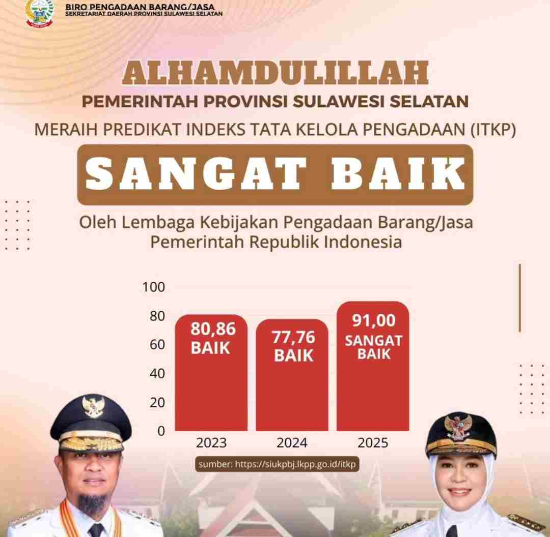 MAKASSAR, NALARMEDIA — Pemprov Sulsel meraih predikat sangat baik dalam Penilaian Indeks Tata Kelola Pengadaan (ITKP) Tahun 2025 pada laman https://siukpbj.lkpp.go.id/itkp.