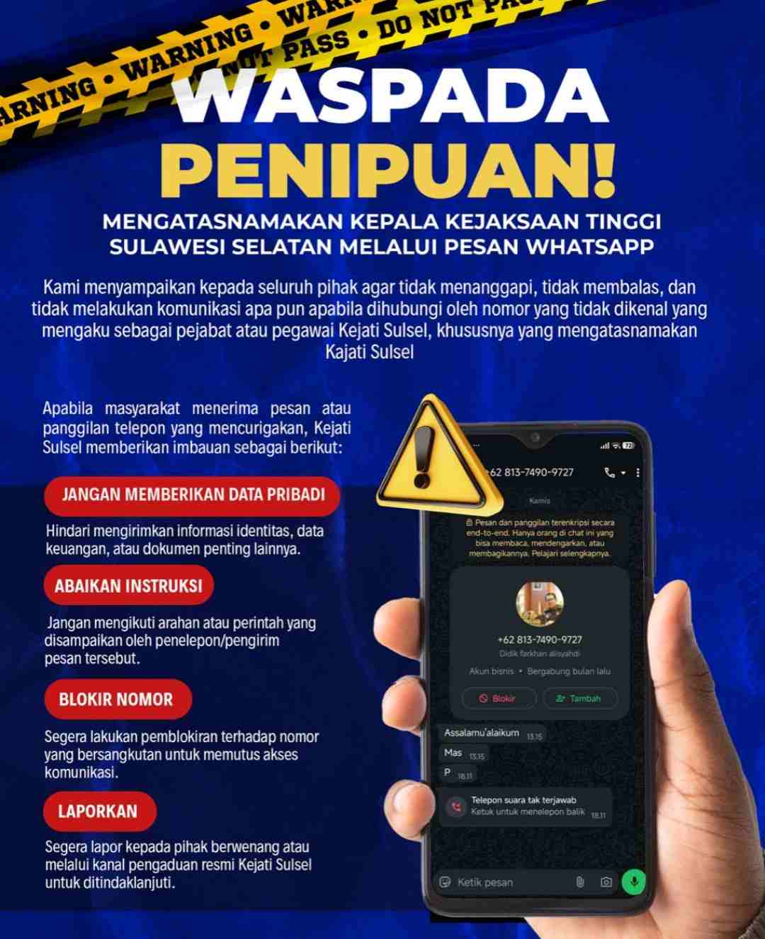 Apabila masyarakat menerima pesan atau panggilan telepon yang mencurigakan, Kejati Sulsel memberikan imbauan sebagai berikut: