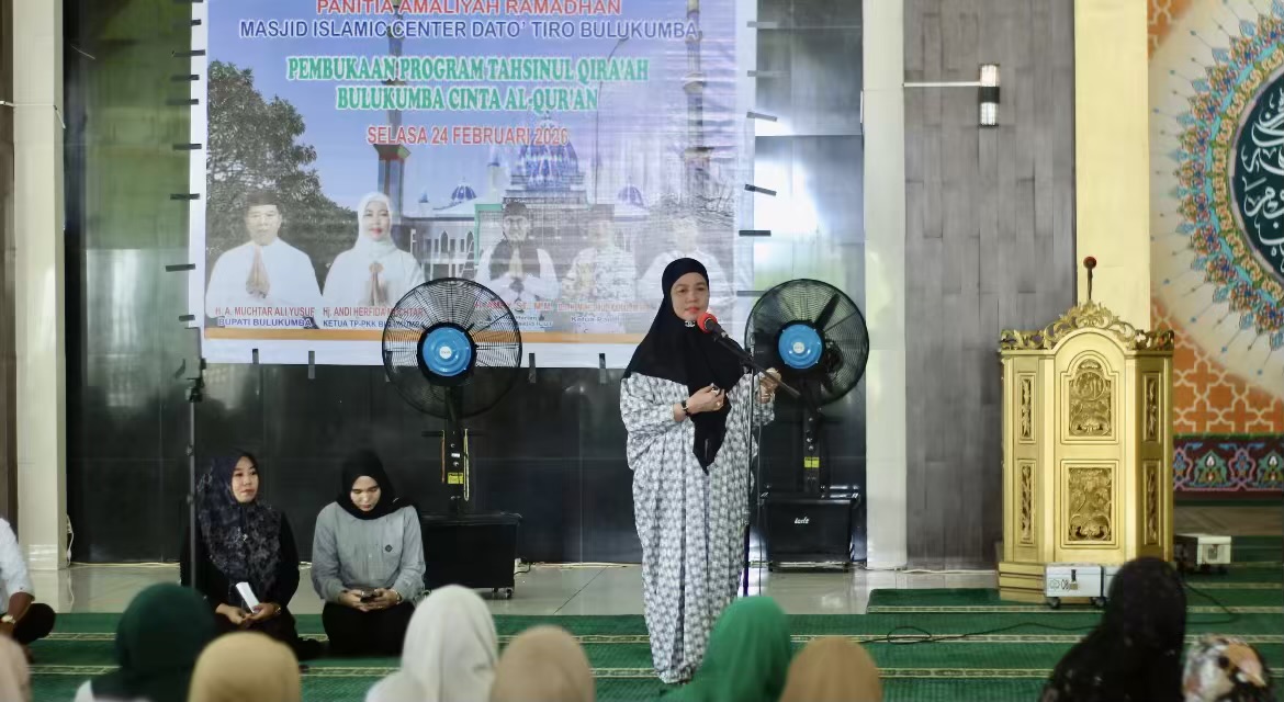 BULUKUMBA, NALARMEDIA – Ketua Tim Penggerak PKK Kabupaten Bulukumba, Andi Herfida Muchtar, menghadiri sekaligus membuka kegiatan Tahsinul Qira’ah Bulukumba Cinta Al-Qur’an yang diselenggarakan oleh Panitia Amaliah Ramadhan di Masjid Islamic Center Dato’ Tiro (ICDT), Selasa, 24 Februari 2026.