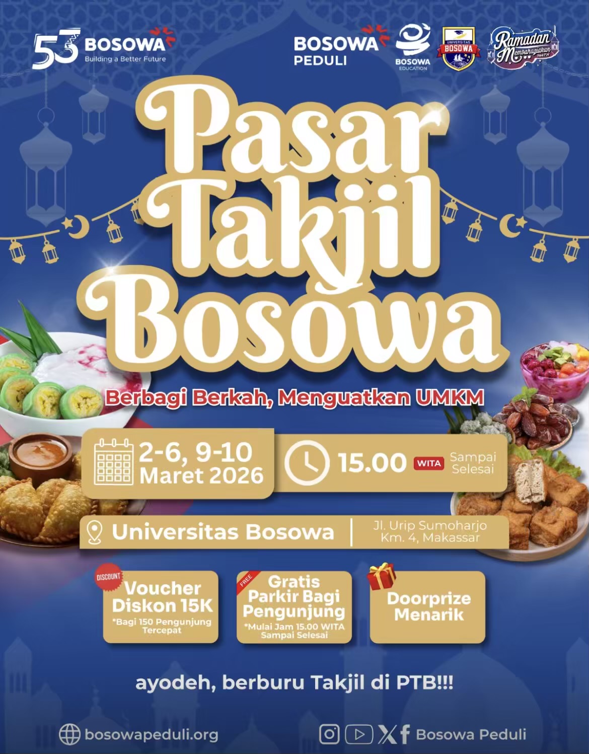 Bosowa Peduli resmi menyelenggarakan Pasar Takjil Bosowa 2026 yang digelar di area Universitas Bosowa pada 2–6 dan 9–10 Maret 2026 mulai pukul 15.00 Wita hingga selesai.