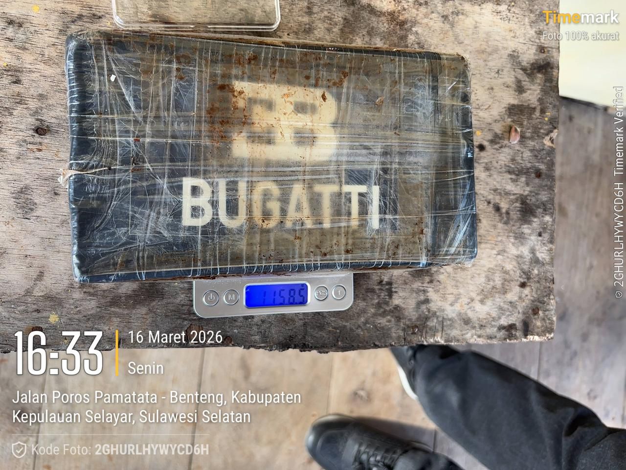 Kasat Resnarkoba Polres Kepulauan Selayar AKP Suhardiman mengatakan barang yang ditemukan berupa satu bungkusan plastik hitam bertuliskan “BUGATTI” berbentuk persegi panjang yang diduga berisi narkotika jenis kokain dengan berat bruto sekitar 1,158 kilogram.