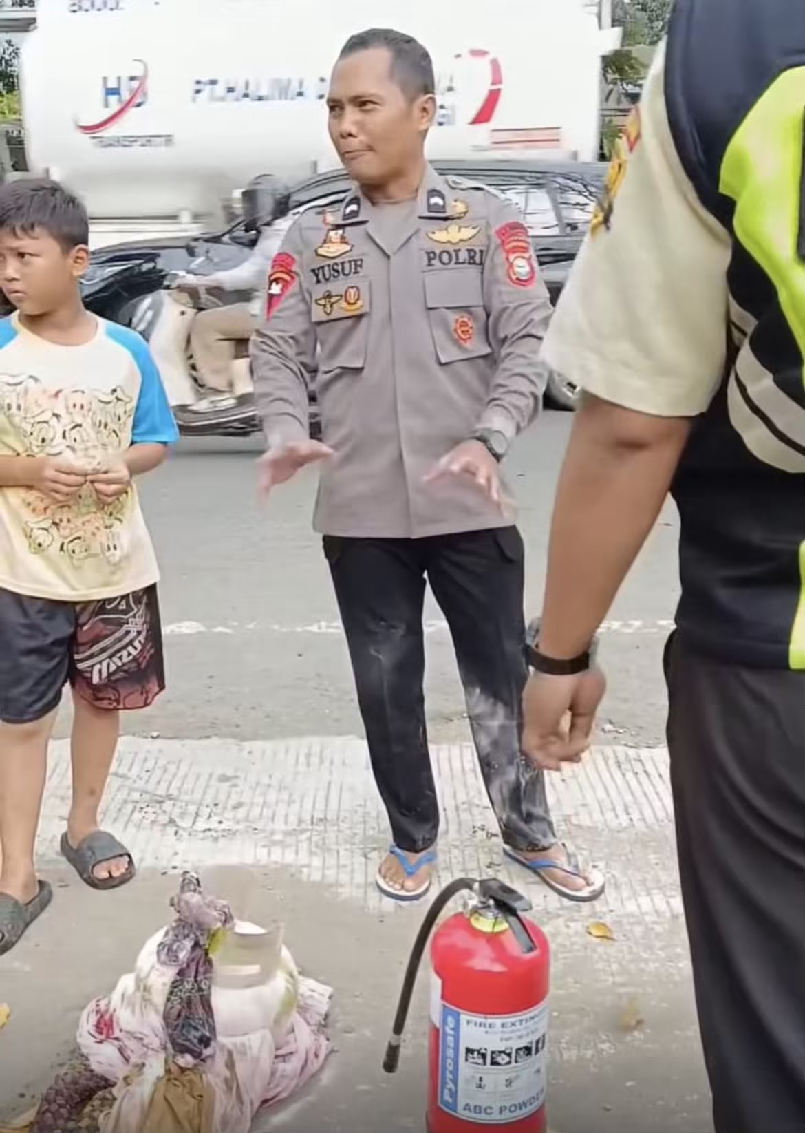 Di tengah kepulan asap, Bripda Yusuf menerjang ke dalam dan langsung menyemprotkan APAR tepat ke titik api.