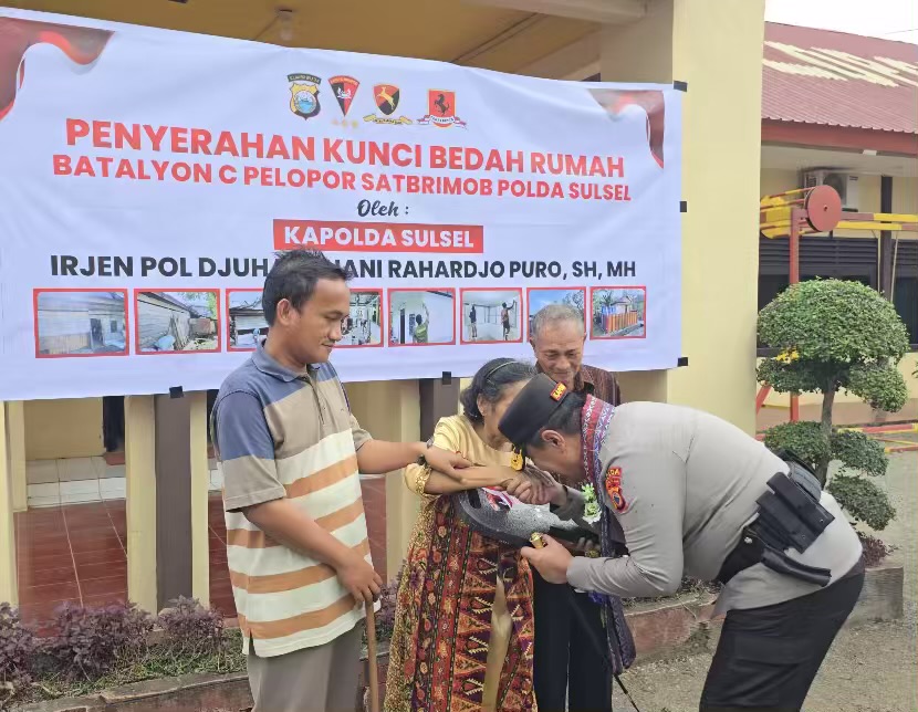 Bertempat di Mako Batalyon C Pelopor Satbrimob Polda Sulsel, suasana yang awalnya berlangsung khidmat dalam prosesi penyerahan bantuan program bedah rumah, mendadak berubah menjadi haru.