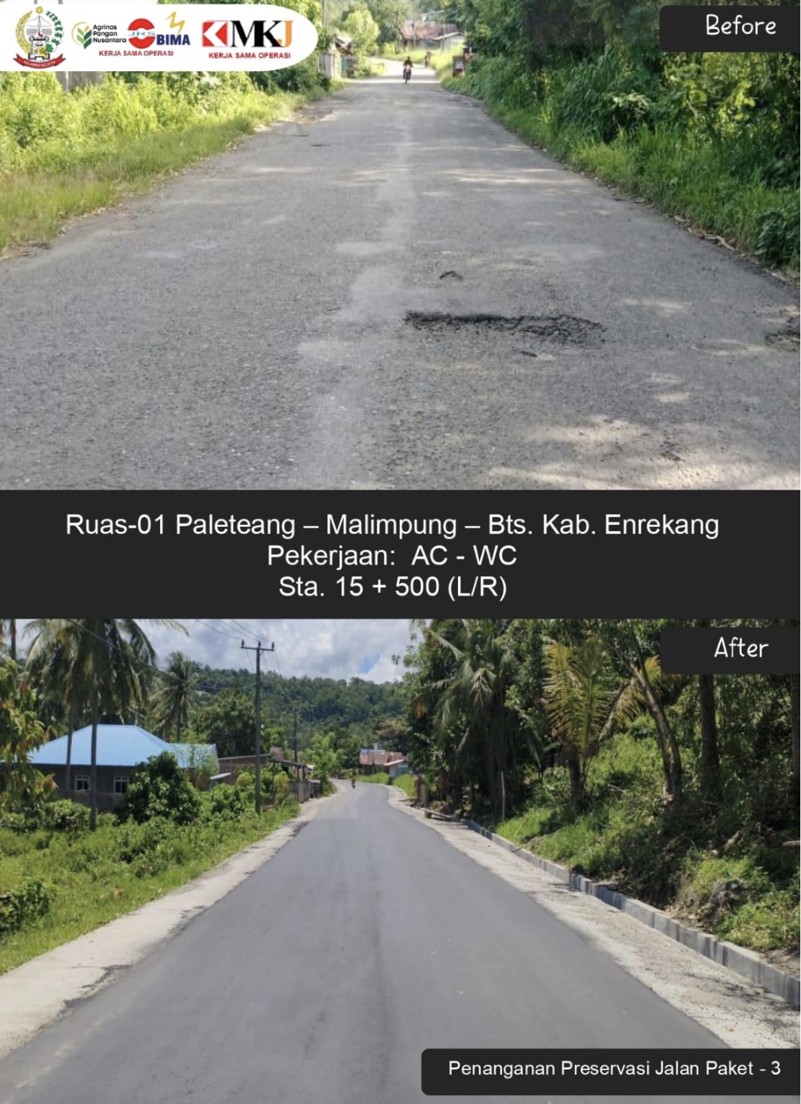Penanganan preservasi jalan Paket 3 MYP juga mencakup sejumlah ruas lainnya, antara lain ruas Paleteang–Malimpung–Batas Kabupaten Sidrap, ruas Pangkajene Sidrap–Rappang, ruas Paleteang–Malimpung–Batas Kabupaten Enrekang, serta ruas Batas Kabupaten Sidrap–Malimpung, dengan jenis pekerjaan yang beragam, mulai dari overlay aspal hingga rabat beton bahu jalan.