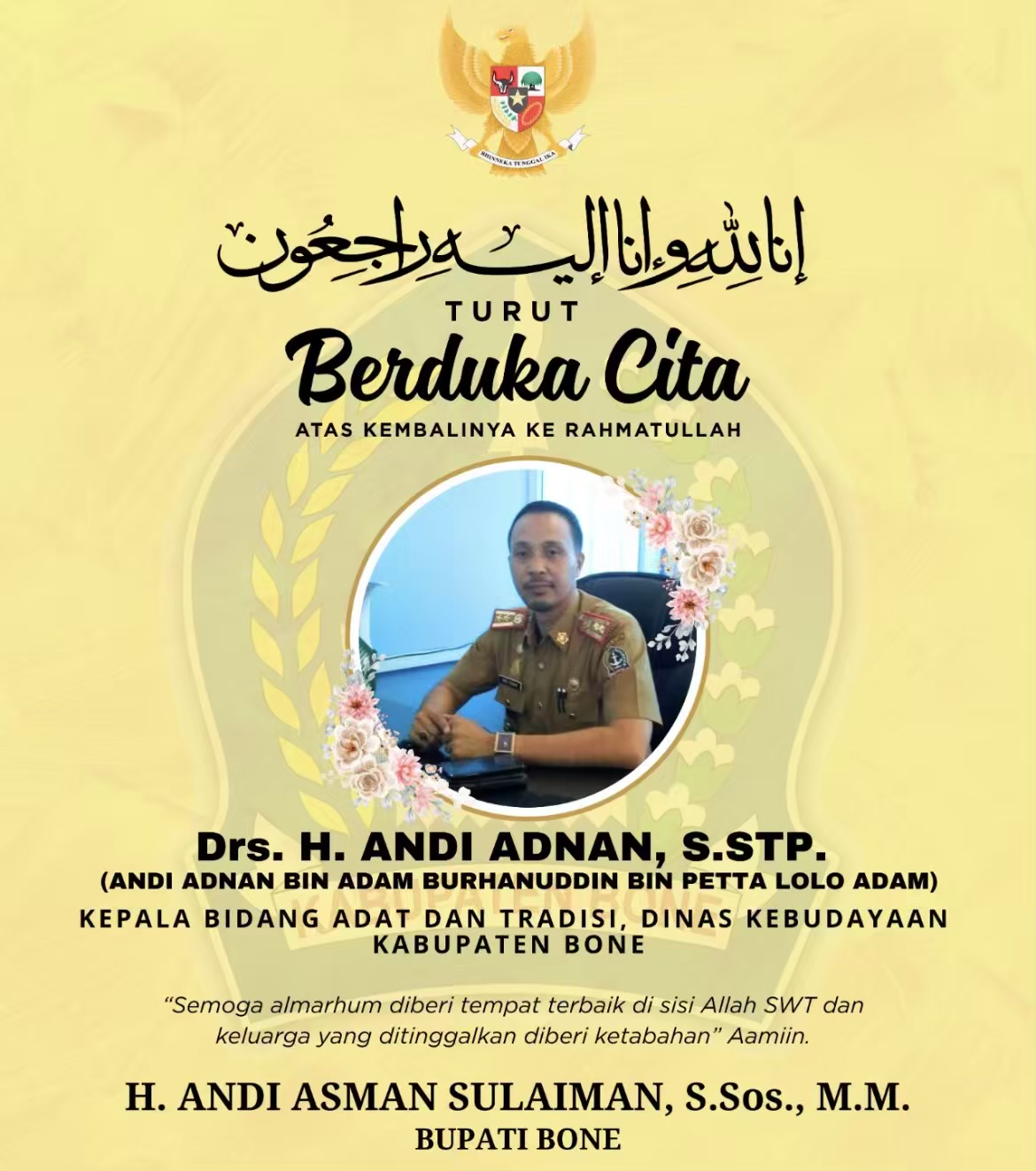 Kepala Bidang Adat dan Tradisi Dinas Kebudayaan Kabupaten Bone, Andi Adnan, meninggal dunia pada Ahad, 26 April 2026.